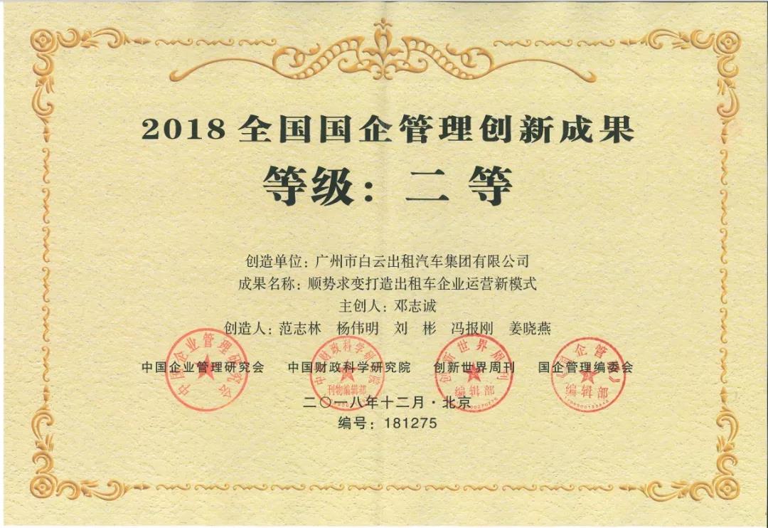 廣州公交集團白云公司申報的“順勢求變打造出租車企業運營新模式”項目,以及由廣州市人民政府國有資產監督管理委員會推薦申報的“羊城通二維碼交通支付云平臺”雙雙榮獲2018全國國企管理創新成果二等獎。
