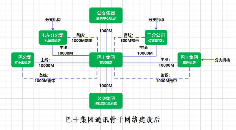(三)項目概況:為解決巴士集團各單位、數(shù)據(jù)中心之間獨立組網(wǎng)、網(wǎng)絡(luò)的整體性、統(tǒng)一性不強的問題,引入相應的解決方案,為各類業(yè)務(wù)提供端到端的加密隧道,同時能增強網(wǎng)絡(luò)可控可管理能力。根據(jù)規(guī)劃方案中的部署計劃,采購單位各分支機構(gòu)采用電路+SDWAN連接數(shù)據(jù)中心(主鏈路采用萬兆點對點電路,備鏈路采用千兆上網(wǎng)寬帶),通過SDWAN技術(shù)(軟件定義廣域網(wǎng))實現(xiàn)主備冗余(當主鏈路故障時,自動切換到備鏈路,確保網(wǎng)絡(luò)不中斷;備鏈路平時可用于日常辦公上網(wǎng)),當分支機構(gòu)只有一條互聯(lián)網(wǎng)線路時,則如果訪問內(nèi)網(wǎng)系統(tǒng)則通過SDWAN技術(shù)連接,訪問互聯(lián)網(wǎng)數(shù)據(jù)則通過寬帶自有方式連接;東興機房與公交集團連接擬租用兩條千兆點對點電路,基于公交集團網(wǎng)絡(luò)架構(gòu)實現(xiàn)雙線負載(兩條鏈路同時工作,其中一條故障不影響網(wǎng)絡(luò)連通)。