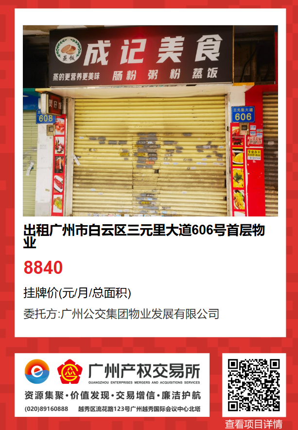 現(xiàn)有廣州市白云區(qū)三元里大道606號首層物業(yè)出租項目,該項目在廣州公有物業(yè)出租平臺網(wǎng)站自掛牌公開招租,歡迎有意向的企業(yè)法人或自然人(含個體工商戶)參加應(yīng)租。現(xiàn)將有關(guān)事項說明如下: