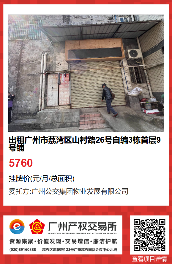 現有廣州市荔灣區山村路26號自編3棟首層9號鋪物業出租項目,該項目在廣州公有物業出租平臺網站自掛牌公開招租,歡迎有意向的企業法人或自然人(含個體工商戶)參加應租?,F將有關事項說明如下: