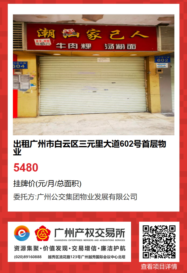 現(xiàn)有廣州市白云區(qū)三元里大道602號首層物業(yè)出租項(xiàng)目,該項(xiàng)目在廣州公有物業(yè)出租平臺網(wǎng)站自掛牌公開招租,歡迎有意向的企業(yè)法人或自然人(含個體工商戶)參加應(yīng)租?,F(xiàn)將有關(guān)事項(xiàng)說明如下: