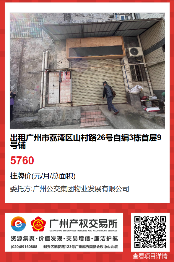現有廣州市荔灣區山村路26號自編3棟首層9號鋪物業出租項目,該項目在廣州公有物業出租平臺網站自掛牌公開招租,歡迎有意向的企業法人或自然人(含個體工商戶)參加應租?,F將有關事項說明如下:
