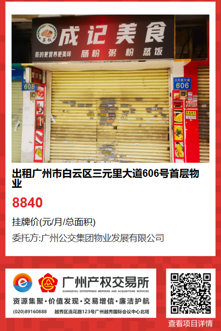 現(xiàn)有廣州市白云區(qū)三元里大道606號首層物業(yè)出租項目,該項目在廣州公有物業(yè)出租平臺網(wǎng)站自掛牌公開招租,歡迎有意向的企業(yè)法人或自然人(含個體工商戶)參加應(yīng)租。現(xiàn)將有關(guān)事項說明如下: