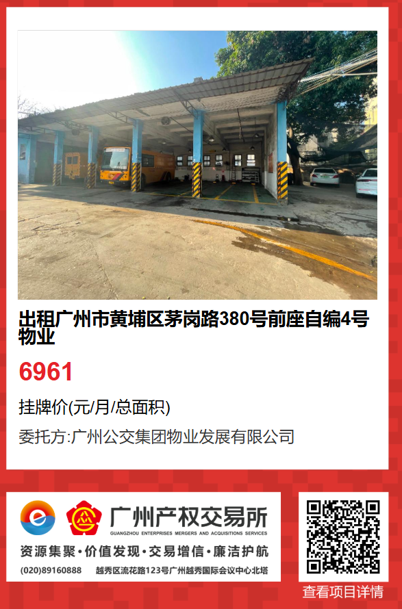 現有廣州市黃埔區茅崗路380號前座自編4號物業出租項目。該項目在廣州產權交易所網站掛牌公開招租,歡迎有意向的企業法人或自然人(含個體工商戶)參加應租?,F將有關事項說明如下: