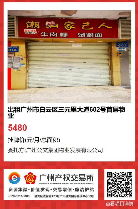 現(xiàn)有廣州市白云區(qū)三元里大道602號(hào)首層物業(yè)出租項(xiàng)目,該項(xiàng)目在廣州公有物業(yè)出租平臺(tái)網(wǎng)站自掛牌公開招租,歡迎有意向的企業(yè)法人或自然人(含個(gè)體工商戶)參加應(yīng)租。現(xiàn)將有關(guān)事項(xiàng)說明如下: