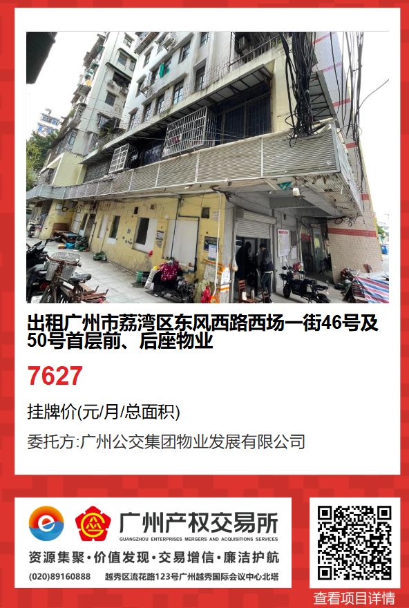 現(xiàn)有廣州市荔灣區(qū)東風(fēng)西路西場一街46號及50號首層前、后座物業(yè)出租項目,該項目在廣州公有物業(yè)出租平臺網(wǎng)站自掛牌公開招租,歡迎有意向的企業(yè)法人或自然人(含個體工商戶)參加應(yīng)租。現(xiàn)將有關(guān)事項說明如下: