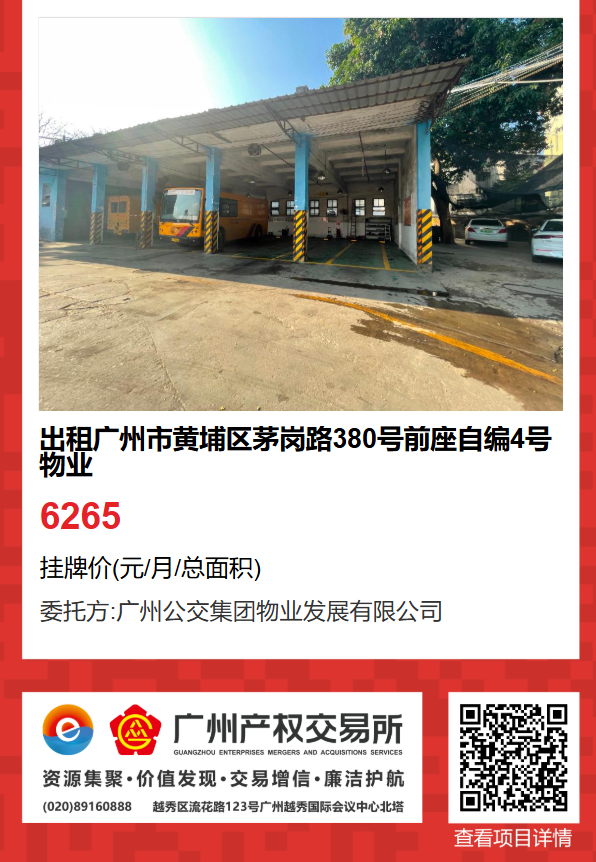 現有廣州市黃埔區茅崗路380號前座自編4號物業出租項目。該項目在廣州產權交易所網站掛牌公開招租,歡迎有意向的企業法人或自然人(含個體工商戶)參加應租。現將有關事項說明如下: