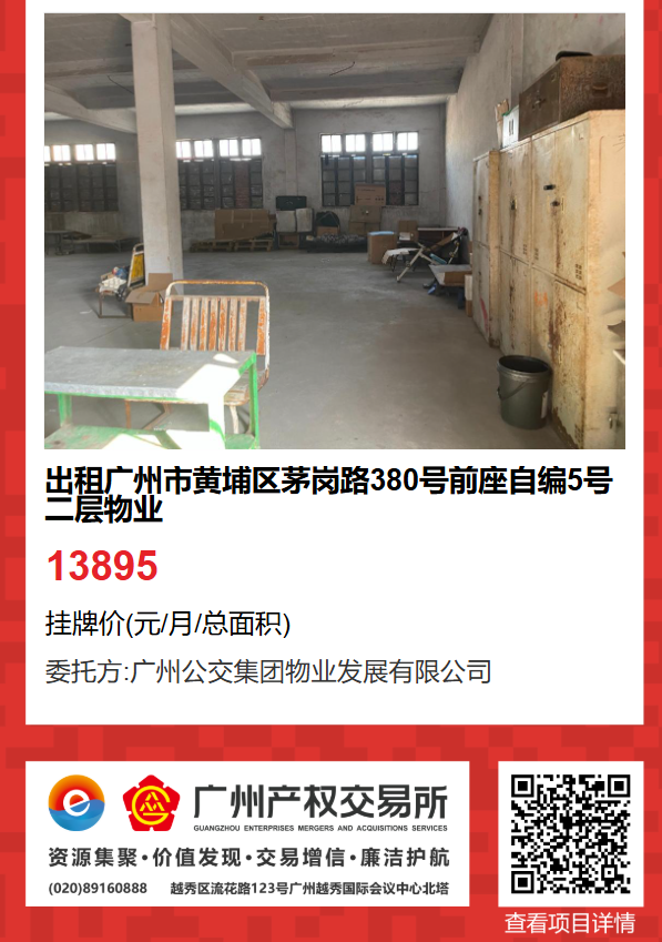現(xiàn)有廣州市黃埔區(qū)茅崗路380號(hào)前座自編5號(hào)二層物業(yè)出租項(xiàng)目。該項(xiàng)目在廣州產(chǎn)權(quán)交易所網(wǎng)站掛牌公開招租,歡迎有意向的企業(yè)法人或自然人(含個(gè)體工商戶)參加應(yīng)租。現(xiàn)將有關(guān)事項(xiàng)說明如下: